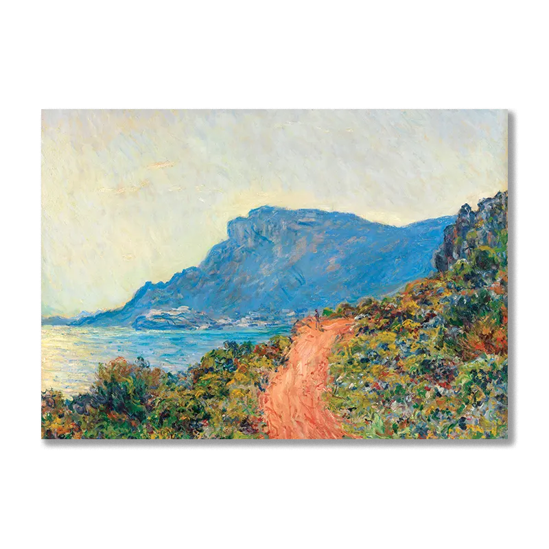Hikers will love experiencing the vast expanse in this Monet. Journey along the dazzling Monaco coast with a breathtaking view from La Corniche. This sun-drenched landscape cascading towards the azure sea with vibrant light and color is grand and expansive. Use it to create an uplifting or adventurous mood.