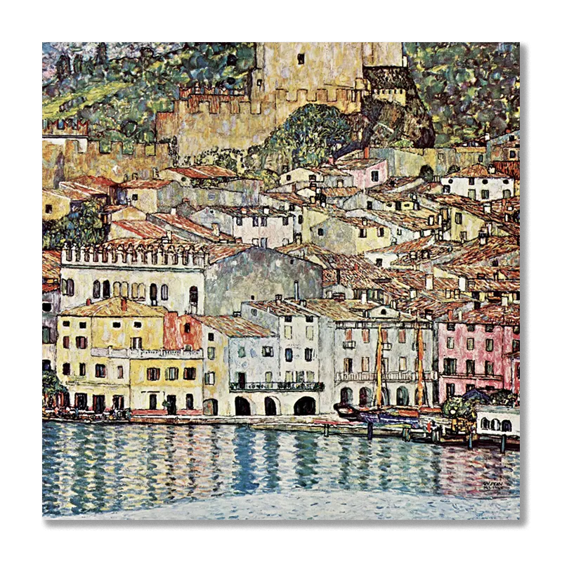 A charming Italian village is captured here as a vibrant, mosaic-like landscape shimmering under a clear sky. It’s picturesque and joyful, and great for creating an uplifting mood.