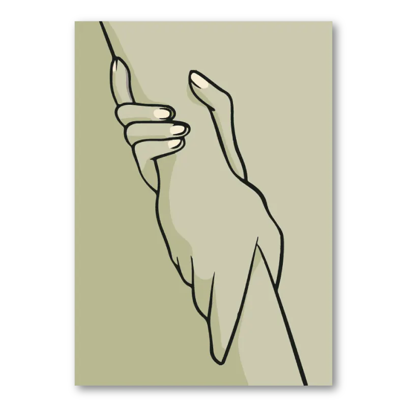 This minimalist line art of one hand rescuing another makes a warm and comforting impression. The pink colour option is feminine while the greens are calm and easy to pair with other neutral themes.