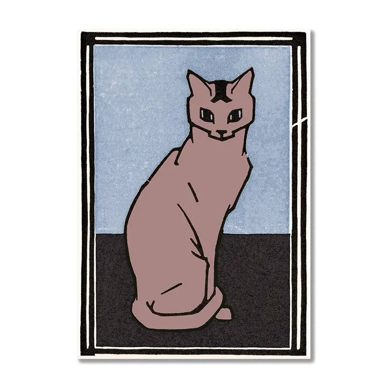 A stately cat poses gracefully with a quiet sense of self-command. This graphical woodcut print with a soft colour palette goes well with minimalist spaces.