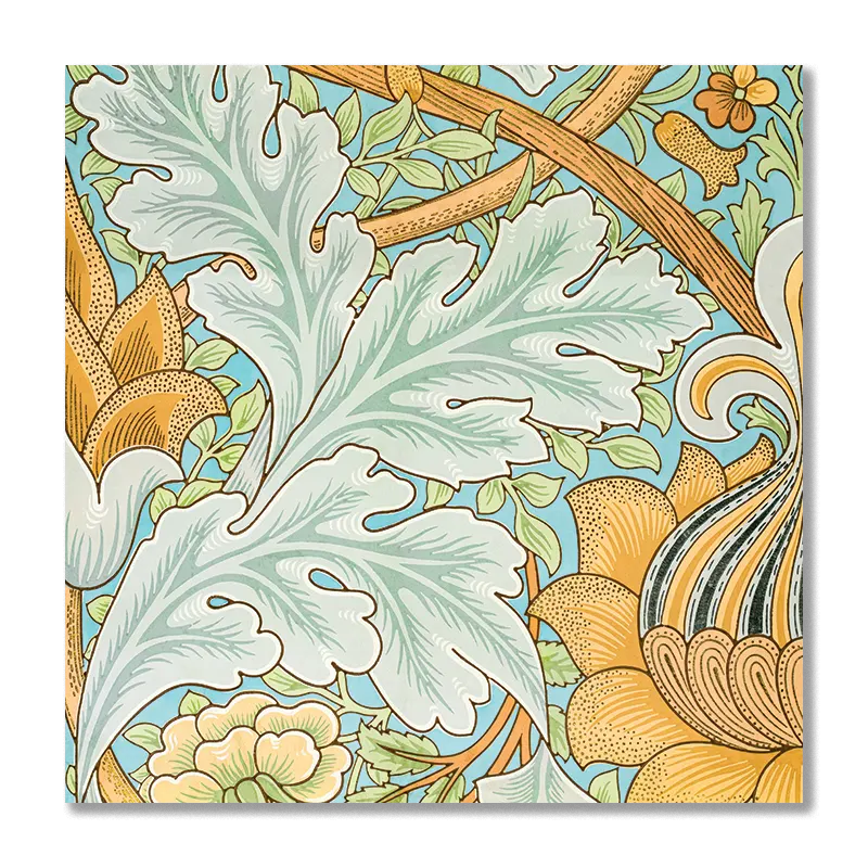 The symmetrical dance of stylized acanthus leaves and florals create a grand yet balanced pattern. It’s colourful and engaging, useful to add life to stately or artsy interiors.